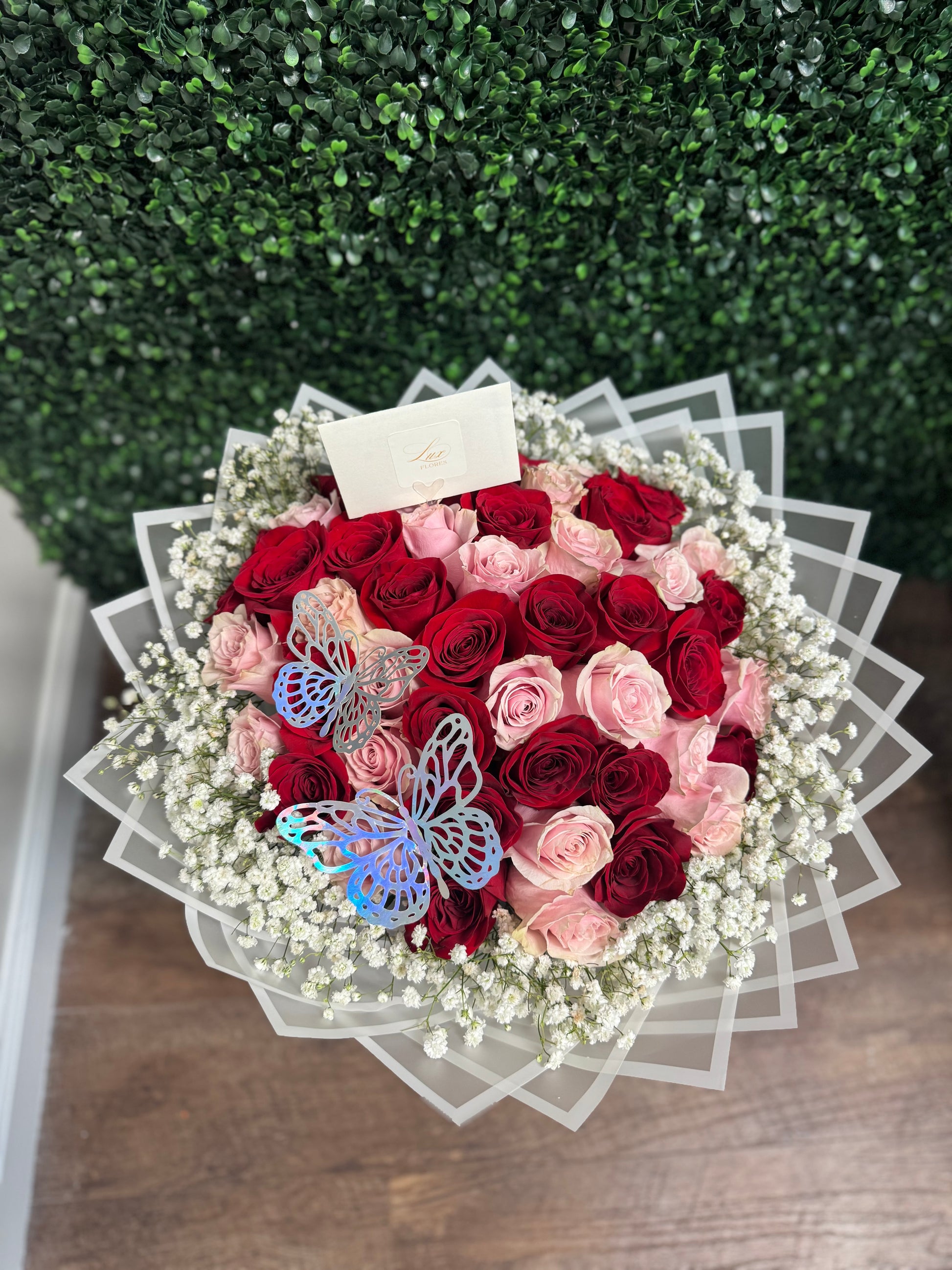 50 red and pink roses with baby’s breath rim wrapped in white paper.